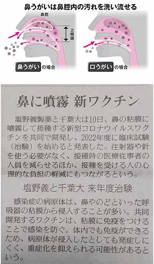 新年早々、爆発的に流行したいる「オミクロン株」にも3蜜を避け「マスク」「うがい」「手洗い」が推奨されています。そんな中で最近、「鼻うがい」というフレーズを良く耳にします。この「鼻うがい」は、鼻の中をキレイに洗い流すことができる為、鼻洗浄とも呼ばれています。この「鼻うがい」を提唱されて上咽頭の炎症治療を専門にされている、仙台市「堀田修クリニック」の堀田先生がラジオ番組にリモート出演されて、お話をされていましたのでご紹介いたします。先生によると特に今回のオミクロン株は、鼻と喉の上咽頭にウィルスが留まり、炎症を起こすので上咽頭ケアをする事は重症化を防ぎ、早期の回復と周りに感染させない事と花粉症やアレルギーにも効果があるそうです。また新型コロナに関しては昨年、重症化率が高かったアルファ株による米国で鼻うがいの臨床研究が行われ、早期の段階で1日2回の鼻うがいで、その後の入院や死亡のリスクを1/8に減少したと報告されているそうです。また2月11日付け読売新聞朝刊に、興味深い記事がありましたのでご紹介します。